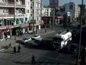 Adıyaman Emniyet Müdürlüğü tarafından dağıtılan kaza görüntüleri içersinde en ilginci Atatürk Bulvarı Saat Kulesi kavşağında meydana geldi. Saat Kulesi kavşağında kırmızı ışıkta bekleyen yakıt tankerinin önünden geçerken araçlara yeşil ışık yanması üzerine tanker harekete geçti. Sürücünün yayayı fark etmemesi üzerine hareket edince, yaya tankerin önünden kaçmak istedi. Tanker sürücüsü aracı sürmeye devam edince önündeki şahıs tankerin önünde koşmaya başladı. Tankerin önünde bir süre koşan şahıs daha sonra yan tarafa düştü.
