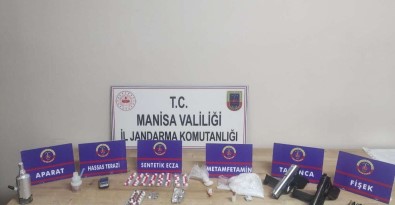 Manisa Il Jandarma Komutanligi Alasehir ilçesinde uyusturucu madde imal ve ticareti yapan sahislara yönelik Alasehir Ilçe Jandarma ve Manisa Il Jandarma Komutanligi KOM Sube Müdürlügü ekiplerince yapilan operasyonda, süpheli 2 kisinin ikametinde arama yapildi. Aramalarda; 195 gram metamfetamin, 65 adet hap, 1 adet 7.65 tabanca, 1 adet kurusiki tabanca, 6 adet 7.65 fisek, 7 adet uyusturucu kullanma aparati ele geçirildi. Gözaltina alinan H.A ve M.B isimli sahislar “Uyusturucu Madde Imal ve Ticareti Yapma” suçundan tutuklanarak cezaevine gönderildi.