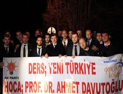 Pankart açarak Başbakan Davutoğlu’na sevgi gösterisinde bulunan AK Parti Kırklareli Gençlik kolları grubu Başbakan Davutoğlu ile fotoğraf çekildi. Pankartta “Ders Yeni Türkiye, Hoca Ahmet Davutoğlu" yazısının arkasına Başbakanı da alarak fotoğraf çektiren partililer başbakanı Kırklareli’den Çorlu'ya uğurladı.