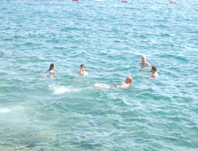 Belediye başkanı ve kız daha sonra mendireğin açığında kendilerini bekleyen içinde eşi Hülya Kocadon’un da bulunduğu tekneye denize açıldı.
