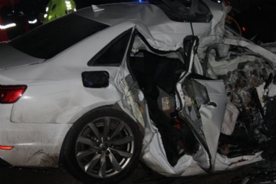 Çarpışmanın şiddetiyle otomobil demir yığını haline dönüşürken, savrulan TIR ise anayoldaki bariyere çarparak durabildi.