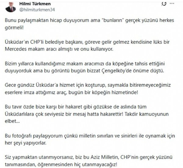 Türkmen, söz konusu makam aracının ve Dedetaş'ın köpeğini gezdiren bir bakıcının yer aldığı kareleri paylaşarak şu ifadelere yer verdi: