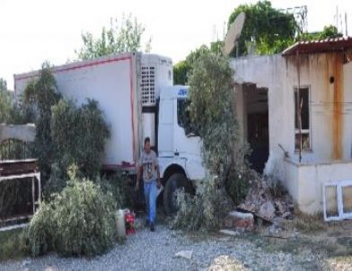 Evin duvarını yıkarak içeri giren kamyonun sürücüsü ve yanındaki 9 yaşındaki kızı yara almadan kurtuldu. Kaza sırasında evde kimsenin olmaması da teselli oldu. Kaza, bugün saat 16.00 sıralarında Okurcalar beldesi Alpaslan Türkeş Bulvarı üzerine meydana geldi. İzmir’den yüklediği çikolataları Alanya’daki zincir marketlere götüren Halil Kızılgüneş (35), Okurcalar Beldesine gelen 35 AV 6232 plakalı çikolata yüklü kamyonun ön lastiği patladı. Yokuş aşağı inen kamyon bariyerleri parçalayarak yolun karşı şeridine geçti. Servis yolunu geçen kamyon zeytin ağaçlarını yıkıp Okurcalar Merkez Mahalle Muhtarı Mehmet Uygun’a ait eve girdi. Evin oturma odasına giren kamyon duvarın bir kısmını yıktı. Eşyaların kısmen zarar gördüğü kaza sırasında evde kimse bulunmaması sevindirdi. Kamyon sürücüsü ile 9 yaşındaki kızı da yara almadan kurtuldu. Ev sahibi Muhtar Uygun, "Ailemle yayladaydık. Haber verdiler. Geldik baktık eve misafir gelmiş. Ailemin yaylada olması nedeniyle kaza sırasında evde kimsenin bulunmaması faciayı önledi şanslıymışız." dedi.