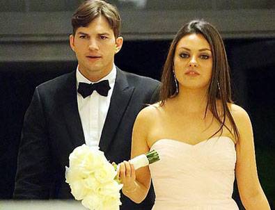 Üzerindeki açık renk elbisesi ve elinde çiçeğiyle gelini andıran Kunis'in sevgilisi Kutcher da smokiniyle damat gibi görünüyordu.