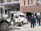 Freni boşalan un yüklü kamyon, polis minibüsünü polisevine soktu