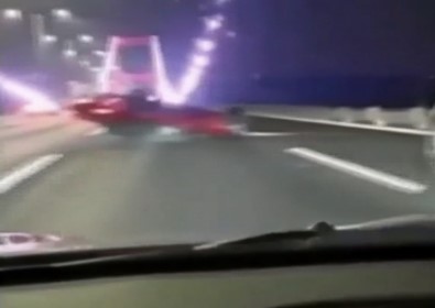 Köprü üzerinde makas attığı sırada iki aracın arasında kalarak takla atan otomobil sürücüsünün karıştığı feci kaza arkasından gelen başka bir sürücü tarafından cep telefonuna kaydedildi. Sosyal medya da paylaşılan görüntülerde, sürücünün makas attığı sırada önce cipe çarpıp sonra takla attığı görülüyor.