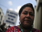 epa02192547 Nobel price winner , Rigoberta Menchu , stands in front of the presidencial house in Guatemala city , 08 June 2010 , during a protest in which shemembers of human rights organizations demand that the Guatemalan president , Alvaro Colom , dismisses the country ' s attorny general , Conrado Reyes , for supossed links with drug dealing . EPA/Ulises Rodr?guez