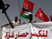 epa02187245 An Israeli soldier stands guard in front of Palestinian demonstrators holding up their nationalthe Turkish flags during a protest against Israel's separation barrier in the village of Maasarah, near the West Bank city of Bethlehem, 04 June 2010. Israel says the network of steelconcrete walls, fencesbarbed wire is needed for security while the Palestinians view it as a land grab that undermines their promised state. EPA/ABED AL HASHLAMOUN