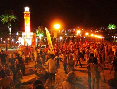 İşçi Partisi, Tüm Gençlik Birliği (TGB), CHP ve DSP’lilerin de bulunduğu grup, Konak meydanı tarihi saat kulesi önünde toplanarak halay çekti ve oturma eylemi yapmaya başladı.
