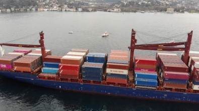 İstanbul Boğazı’nda Rumeli Hisarı açıklarında kıyıya çarpan yük gemisi havadan görüntülendi.