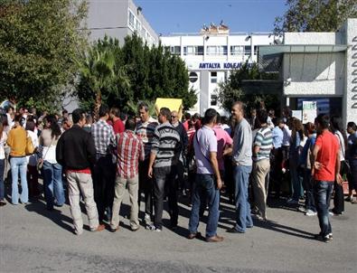 Ellerinde pankart ve dövizle kolej önüne gelen işçiler içeri girerek yönetimle konuşmak istedi. Güvenlik güçlerinin itirazı üzerine içeri giremeyen grup, kolej kapısı girişinde oturma kararı aldı