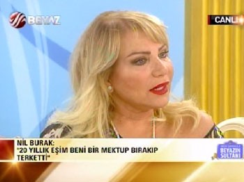 Beyaz Tv ekranlarında yayınlanan Beyaz 'ın Sultan 'ı programının bugünkü konukları Nil Burak ve Sacit Arslan oldu. 20 yıllık eşinin bir mektup bırakarak kendisini terk ettiğini söyleyen Nil Burak, ayrılık tarihine de dikkat çekerek, 'Yılbaşını nerede kutlayacağız diye konuşuyorduk. Sabah beni programa bıraktı akşam da gelip alacaktı ama bırakıp gitti ' diye ekledi. Program sunucusu Seda Sayan 'dan gelen 'Hiçbir gerekçesi yok muydu? ' sorusuna da cevap veren Nil Burak, 'Zaman zaman tartışıyorduk ama hiçbir şey yoktu. Demek ki daha önceden planlanmış bir şeydi. ' dedi. Yaşananları programın diğer bir konuğu olan Sacit Arslan 'a yorumlatan Seda Sayan ise '20 yılın ardından nasıl samimiyetsiz bir şeydir bu ' diye konuştu.
