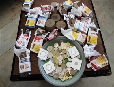 Çantaların özel bölmelerinde bulunan sigara paketleri içerisinde peçetelere sarılı çeşitli boy ve ebatlarda üzerinde Farsça ve Arapça yazıların bulunduğu 176 adet madeni para ile İran’da dini sembol olarak kullanılan 31 adet tarihi mühür ele geçirildi.