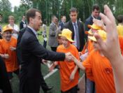 epa02192050 Russian President Dmitry Medvedev ( L ) shakes hands with children spending their summer holiday in ' Levkovo ' summer camp outside Moscow , Russia , 08 June 2010 . EPA/SERGEI CHIRIKOV