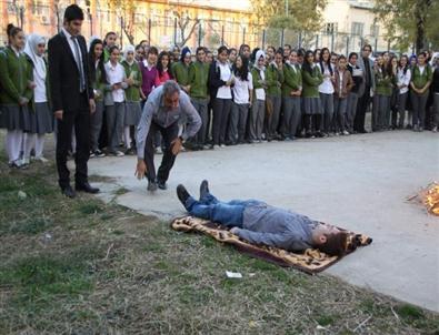 Daha sonra okul bahçesinde yapılan yangın tatbikatında yaralı bir hastaya nasıl müdahale edileceği uygulamalı olarak gösterilirken, etkinlik itfaiye ekiplerinin okul bahçesinde çıkardığı yangına köpükle müdahale etmesiyle son buldu.