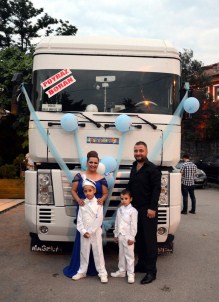 Baba Murat Haliloğlu, oğulları Poyraz (6) ile Boran'ın (9) sünnet düğünü için kendisine ait tırı "sünnet arabası" olarak süsletti. Erkekliğe ilk adımı atan çocuklar, süslenen tırla gezdirildi.
