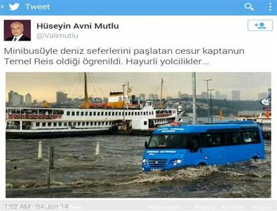 Vapur ve minibüsün aynı karede görüldüğü fotoğrafı paylaşan Vali Mutlu, "Minibusüyle deniz seferlerini paşlatan cesur kaptanun Temel Reis oldiği ögrenildi. Hayurli yolcilikler" ifadelerini kullandı.