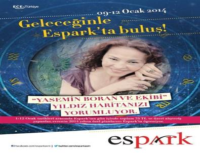 ECE Türkiye tarafından yönetilen Espark Alışveriş Merkezi eğlendirici aktivitelerine devam ediyor. Boran, 9-12 Ocak 2014 tarihlerinde 14.00-17.00 saatleri arasında, 1 Ocak’tan itibaren 75TL ve üzeri alışveriş yapan Espark Alışveriş Merkezi ziyaretçilerinin yıldız haritasını yorumlayacak, astroloji ile ilgili merak ettikleri tüm soruları cevaplayacak ve 2014 yılında burçları neler beklediğinden bahsedecektir.