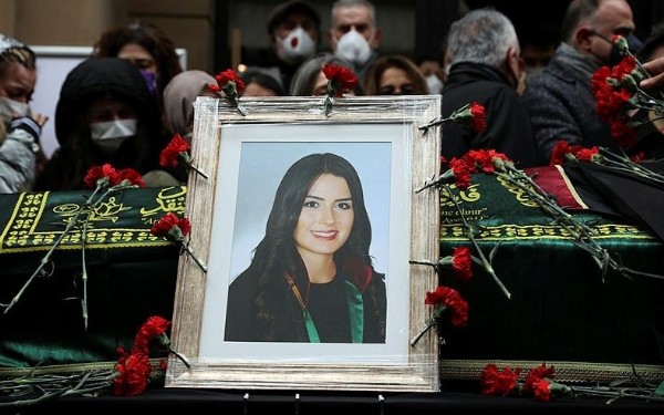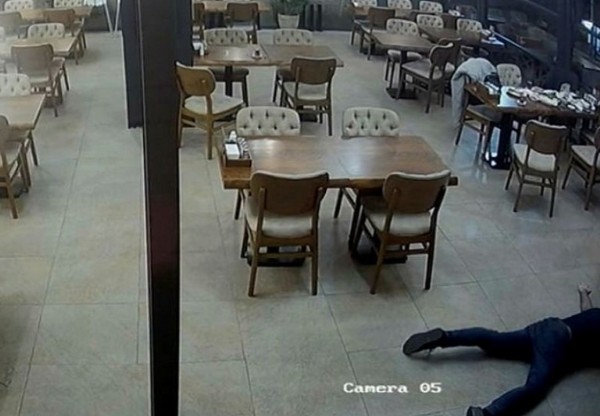 Yıldız'ın endişeli bir ifadeyle ellerini yüzüne doğru götürdüğü, telefonla görüşen şüpheli Dönmez'in telefonu kapatıp bir anda ayağı kalktığı, Dilara Yıldız'ın şüpheliye engel olmaya çalıştığı, Dönmez'in Yıldız'ı yere doğru ittiği, yere düşen genç kadına peş peşe ateş ettiği görülüyor.