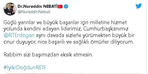 Hazine ve Maliye Bakanı Nureddin Nebati sosyal medya hesabından Başkan Erdoğan'ın doğum gününü kutladı. Nebati: Güçlü yarınlar ve büyük başarılar için milletine hizmet yolunda kendini adayan liderimiz, Cumhurbaşkanımız Rece Tayyip Erdoğan aynı davada sizlerle yürümekten büyük bir onur duyuyor, nice başarılı ve sağlıklı ömürler diliyorum. Rabbim sizi başımızdan eksik etmesin.