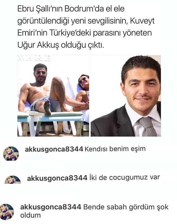 Posta gazetesinin iddiasına göre, Ebru Şallı'nın yeni sevgilisi Uğur Akkuş'un Gonca Derin Akkuş ile evli olduğu ortaya çıktı. Akkuş, Kuveyt Emiri'nin 3 milyar dolarlık yatırımlarına Türkiye'de yön veriyor.