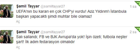 Şamil Tayyar ise UEFA 'nın verdiği men cezası sonrası Twitter 'da Fenerbahçe Başkanı Aziz Yıldırım 'ı ve CHP 'lileri çılgına çevirecek açıklamalar yaparken, futbola neşter atılması gerektiğini ve ilk adımın federasyondan atılması gerektiğini savundu.
