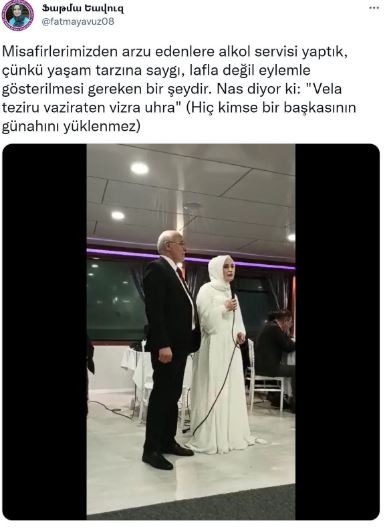 Bu durumu sosyal medya hesabından yayınladığı video ile duyuran Yavuz, 'Misafirlerimizden arzu edenlere alkol servisi yaptık, çünkü yaşam tarzına saygı, lafla değil eylemle gösterilmesi gereken bir şeydir. Nas diyor ki: 'Vela teziru vaziraten vizra uhra' (Hiç kimse bir başkasının günahını yüklenmez)' ifadelerini kullandı.