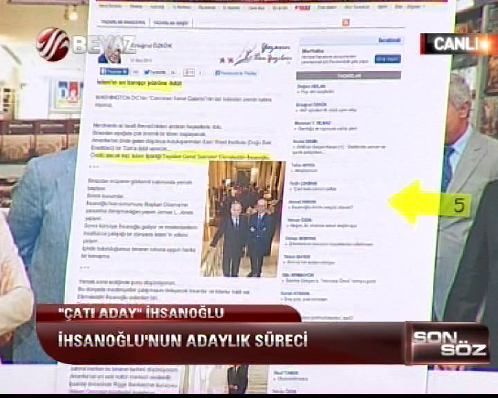 Programda Çatı Aday Ekmeleddin İhsanoğlu'nun konuşulduğu sırada İhsanoğlu'nun CHP'nin değil baronların adayı olduğunu ve Hürriyet Gazetesi'nin de attığı manşetlerle İhsanoğlu'na parlatma operasyonu yaptığını söyledi. Gökçek, Ekmeleddin İhsanoğlu'nun cumhurbaşkanı adayı olacağına çok önceden karar verildiğini de sözlerine ekledi.