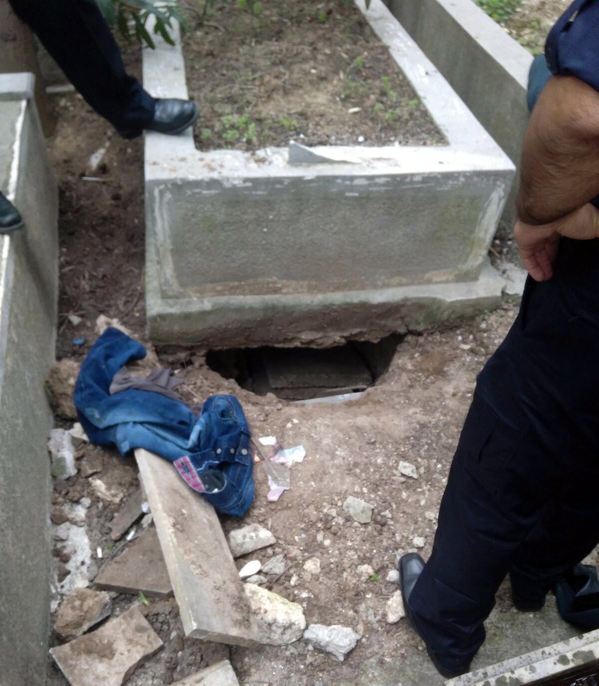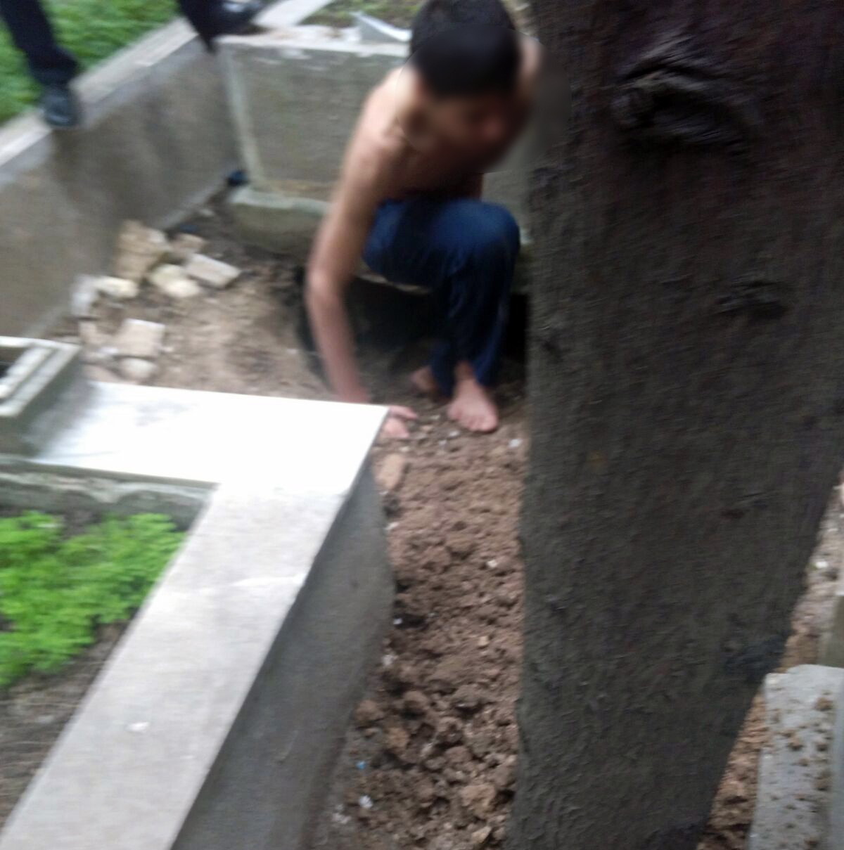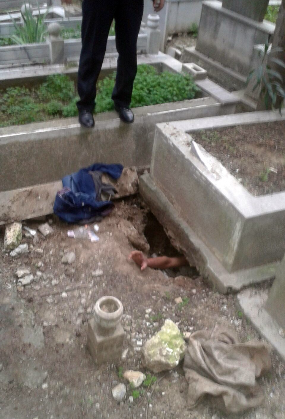 Olay yerine gelen polisler gördükleri karşısında şaşkına döndü. İçeride yabancı uyruklu biri olduğunu anlayan emniyet ekipleri, şahsı çıkarmak için uzun süre dil döktü. Polis mezarın içinden çıkmamakta direnen gence biber gazı sıktı ancak çıkması için yeterli olmadı. Genci çıkmaya ikna edemeyeceklerini anlayan polisler, itfaiye ekiplerini mezarlığa çağırdı. Mezarlığa gelen itfaiye ekipleri mezarın etrafını kazarak Suriyeli gencin çıkmasını sağladı.