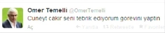 Fenerbahçe 'nin sürekli olarak twitlerle kamuoyuna seslenen yöneticisi Ömer Temelli 3-3 biten Beşiktaş derbisinin ardından Twitter hesabından maçın hakemi Cüneyt Çakır ile ilgili, “Cüneyt Çakır seni tebrik ediyorum. Görevini yaptın' imalı bir tweet attı. Sarı-Lacivertli taraftarlar, bu mesajın ardından Temelli'ye destek verdiler.