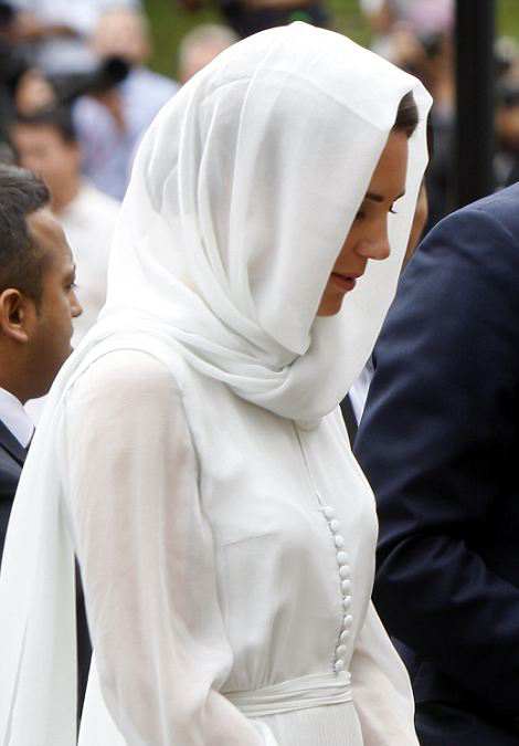 Cambridge Düşesi Kate Middleton hayatında ilk defa cami ziyaretinde bulundu. Saçını örten ve kayınvalidesi Prenses Diana'nın 20 yıl önceki bir cami ziyaretinde üzerinde bulunan kıyafete benzer bir elbise giyinen Middleton, Prenses Diana'yı hatırlattı. Kate ile Başkan Faudziah İbrahim arasında geçen diyalogda ise konu Ayasofya'ydı.