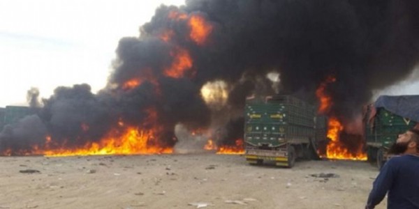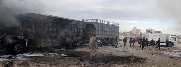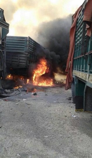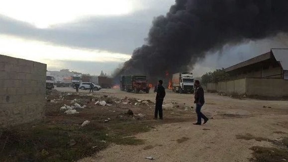 Yerel kaynaklardan alınan bilgiye göre, muhaliflerin denetimindeki Halep'in Azez ilçesinde bulunan Suriyeli göçmenlere giden yardım tırlarının bulunduğu bölgeye düzenlenen hava saldırısında tırlar isabet aldı.