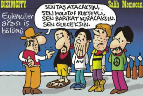 'Eylemciler arası iş bölümü'başlığıyla verilen ve Gezi eylemlerini konu alan karikatürde yüzü görünmeyen gizemli bir kişi eylemcilere neler yapacaklarını anlatıyor.