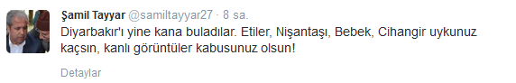 Bunu Cihangir'de oturanlar, Bebek'te oturanlar, Nişantaşı'nda oturanlar, Etiler'de oturanlar... Beren Saat'e kadar herkesin kulağına küpe olsun diye söylüyorum. Beren Saat dahil olmak üzere Nişantaşı, Cihangir sakinleri için bir tweet atmıştım. O kanlı görüntüler kabusunuz olsun.