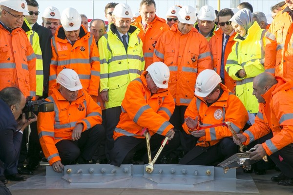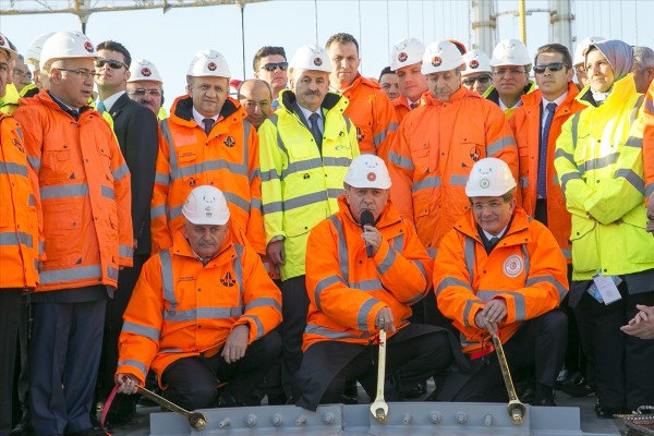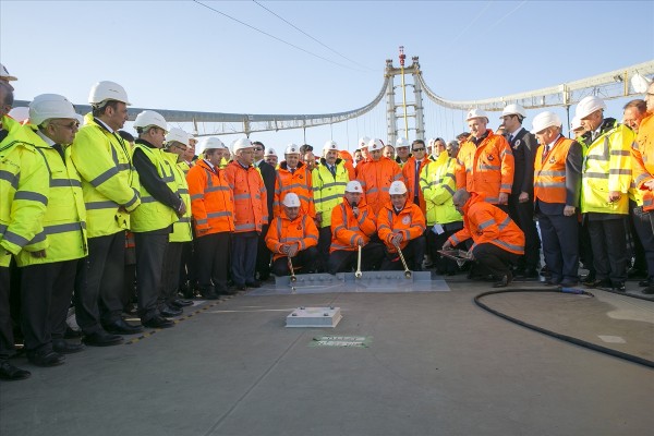 Cumhurbaşkanı Recep Tayyip Erdoğan, Başbakan Ahmet Davutoğlu ile Ulaştırma, Denizcilik ve Haberleşme Bakanı Binali Yıldırım, İzmit Körfez Geçişi Asma Köprüsü'nün son tabliyesini yerleştirdi.