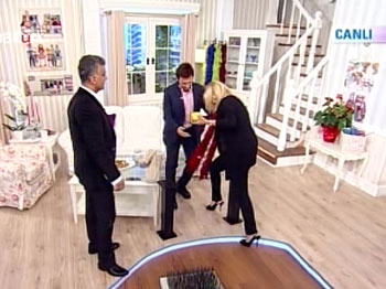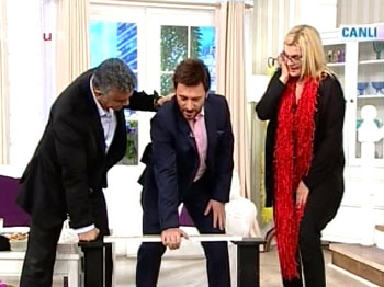 Bir ara Derya Baykal da önündeki cisimi farketmeyerek canlı yayında düşme tehlikesi geçirdi. BEYAZ GAZETE