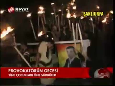 PKK yandaşları, dur durak bilmiyor. Provokatörler, ellerinde meşalelerle ortaya çıkıp, çocukların arkasına saklandılar.