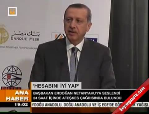 Başbakan Erdoğan, "Netanyahu'ya sesleniyorum; bilesin ki 2012'nin şartları 2008'in şartları gibi değildir. Hesabını iyi yap" diye konuştu.