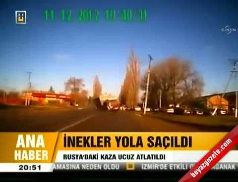 Trafik kazalarıyla ünlü Rusya'dan video paylaşım sitelerine 11 Aralık'ta meydana gelen ilginç bir kaza görüntüsü düştü. Aşırı hızlı olduğu belirtilen büyükbaş hayvan yüklü kamyon, başka bir araca çarptıktan sonra kontrolden çıkıp yolun ortasında yan yattı. Şans eseri sürücünün hafif sıyrıklarla atlattığı kaza sırasında aracın kasasında bulunan inekler yola savruldu. Büyük bir gürültüyle yere düşen bütün ineklerin tekrar ayağa kalktıkları görüldü.
