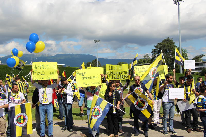 İstanbul'dan uçakla gelen taraftarlar, 4 otobüsü doldurarak Cenevre'den Nyon'a ulaştı. Sırtlarına taşıdıkları çantalara sarı lacivert balon asan taraftarlar, hem UEFA'yı protesto ederken, hem de açtıkları çeşitli pankart ve dövizlerin yanı sıra yaptıkları tezahüratlarla Fenerbahçeli yöneticilere destek verdi.