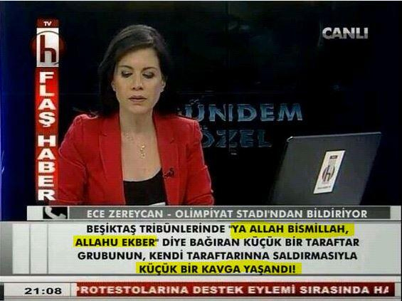 Halk Tv flaş haber olarak verdiği altyazıda'Beşiktaş tribünlerinde'Ya Allah Bismillah Allahuekber'diye bağıran küçük bir taraftar grubunun, kendi taraftarına saldırmasıyla küçük bir kavga yaşandı.