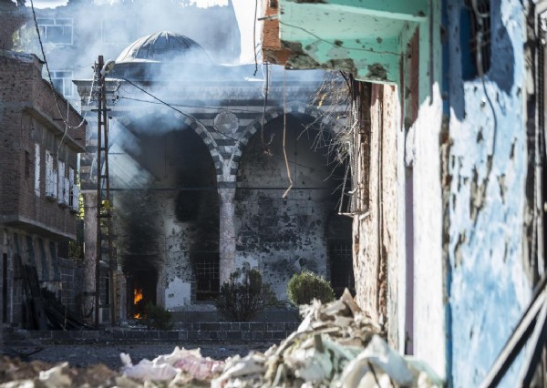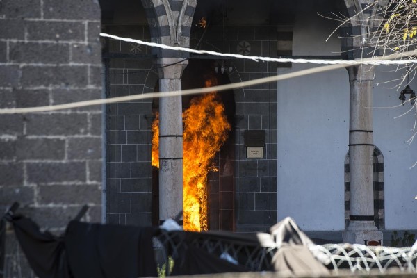 Diyarbakır'ın Sur ilçesinde PKK'lı teröristlerce gerçekleştirilen saldırı, kentin ilk Osmanlı eseri Fatihpaşa Camisi'nde yangına neden oldu.