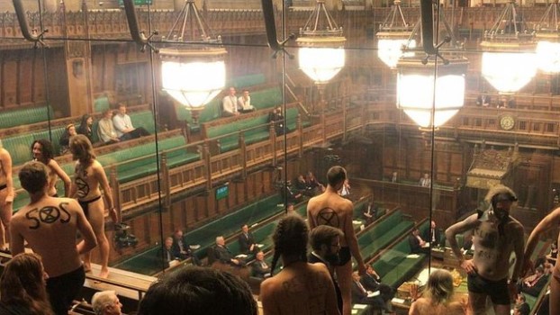 İngiltere hararetli Brexit tartışmalarının yapıldığı sırada bir grup yarı çıplak protestocu parlamento binasında gösteri düzenledi. 'Extinction Rebellion' adındaki grubun 12 üyesi, parlamentoda oturumun yapıldığı salonda halka ayrılmış bölümde üzerlerini çıkararak sloganlar attı.